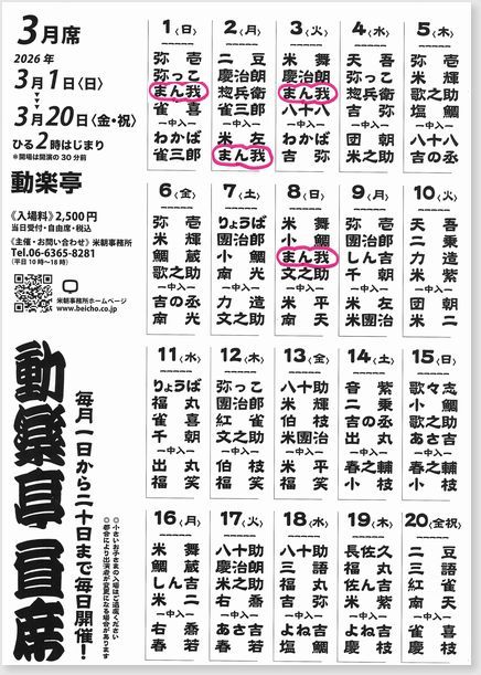 【 動楽亭 出演者変更のお知らせ 】 3月1日(日)、20日(金)昼席に出演を予定しておりました桂雀五郎は、体調不良のため出演を取りやめさせていただき、代わりまして1日(日)は桂まん我、20日(金)は桂紅雀が出演いたします。 誠に申し訳ございませんが、ご了承くださいませ。https://t.co/atRfAzSNDK— 米朝事務所 (@beicho_jimusho) March 1, 2026